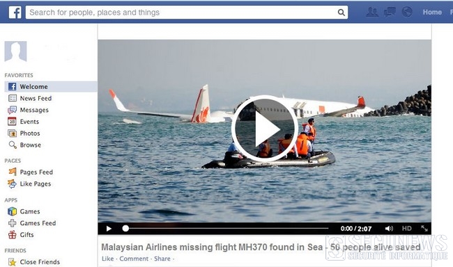 Nous conseillons aux utilisateurs des réseaux sociaux d’être prudents avant de cliquer sur un message dont la source est inconnue, et relatif au « Boeing 777 de Malaysia Airlines » disparu le 8 mars 2014, et toujours introuvable.