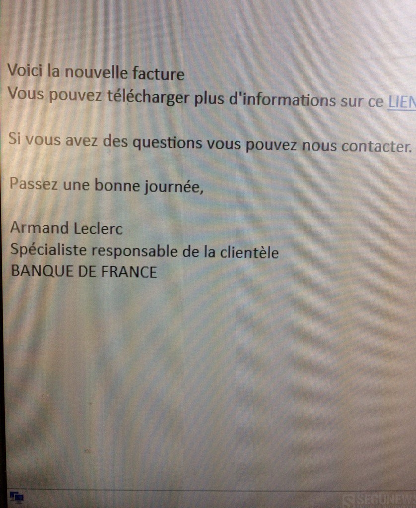 Le mode opératoire des fraudeurs consiste à demander à leurs interlocuteurs, particuliers ou entreprises, de cliquer sur un lien renvoyant vers un faux site (phishing) de la Banque de France, un formulaire de saisie de données invitant l’internaute à communiquer ses coordonnées bancaires ou une page de téléchargement de fichiers qui sont en réalité des logiciels malveillants.