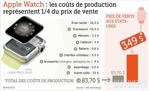 Ainsi, selon le cabinet IHS Technology, l’Apple Watch Sport avec un boîtier de 38 millimètres, le modèle d’entrée de gamme d’Apple, coûterait 83,70 dollars (environs 74,52 euros) à fabriquer, pour un prix de vente de 349 dollars (399 euros sur le marché européen)!