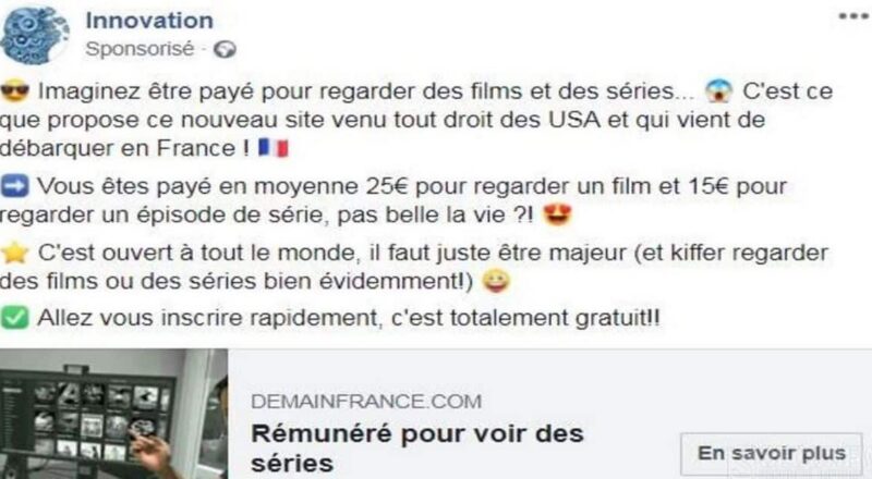 « C’est ouvert à tout le monde, il faut juste être majeur (et kiffer regarder des films ou des séries bien évidemment !) Allez vous inscrire rapidement, c’est totalement gratuit », détaille le post qui redirige vers un article du portail « DemainFrance.com », histoire de rendre plus crédible cette offre.
