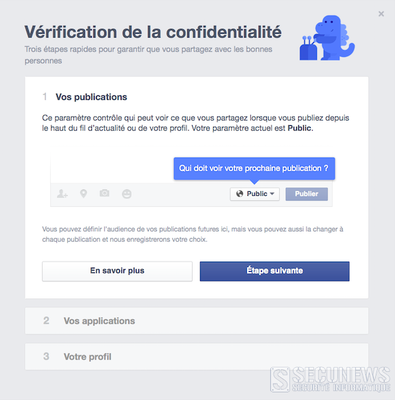 L’outil ‘Vérification de la confidentialité’ se veut intuitif et pédagogique, une mascotte bleue à l’allure de dinosaure propose à l’utilisateur de vérifier sa confidentialité en trois étapes.