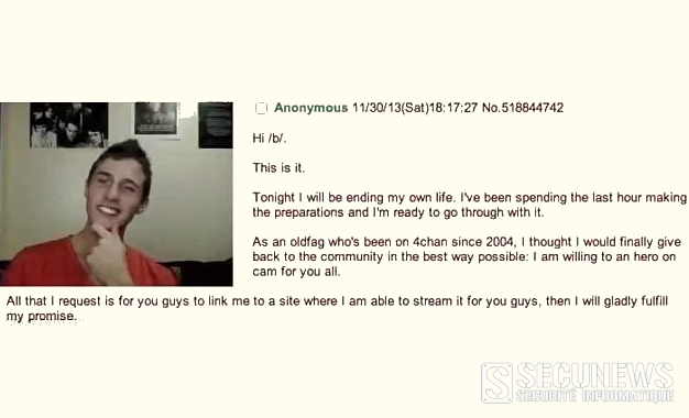 Comme un vieux de la vieille présent sur 4chan depuis 2004, je veux rendre à la communauté ce qu’elle m’a donné de la meilleure des façon: je vais être un héros (en se suicidant) devant la caméra.
