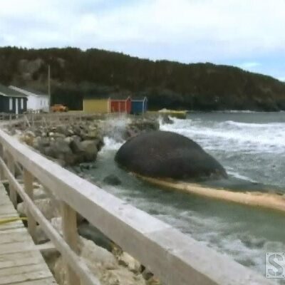 Une baleine bleue prise par les glaces en hiver et échouée sur les côtes du Saint-Laurent à l’ouest de Terre-Neuve (Canada) est en pleine décomposition […]