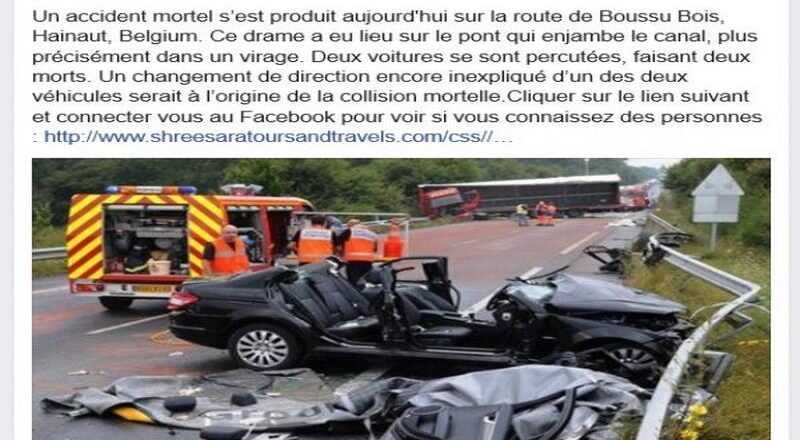 Accompagnant ces photos, un petit texte présentant les circonstances d’un faux drame de la route et, surtout, un lien à cliquer pour voir si les victimes ne font pas partie de vos connaissances.