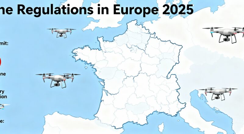 La France suit la réglementation européenne avec des règles adaptées pour les zones urbaines et une application stricte sur la hauteur et les distances à respecter autour des personnes. L’enregistrement est obligatoire, tout comme une formation pour certains poids de drones.