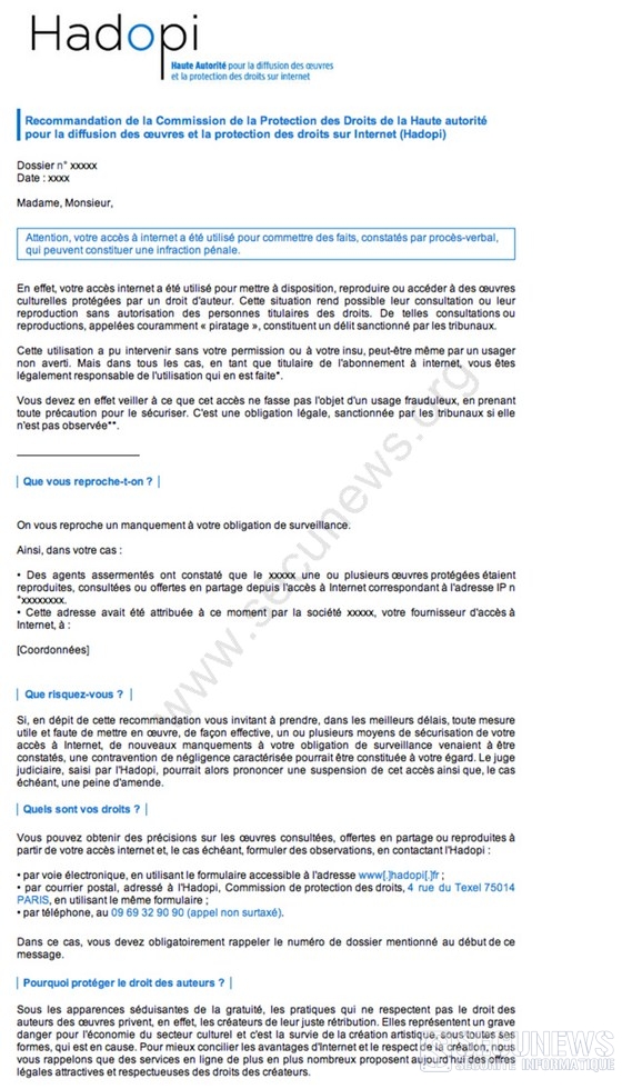 La Haute autorité pour la diffusion et la protection des droits sur Internet vient de rendre public son courrier d’avertissement.